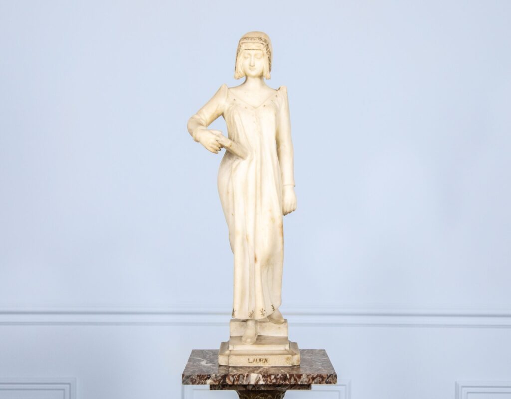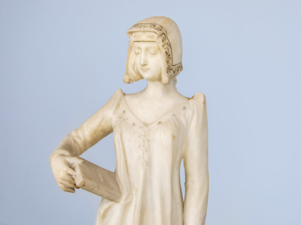 Вишукана інтер’єрна скульптура «Лаура» з білого алебастру з легким теплим патинуванням. Скульптура зображує молоду жінку в середньовічному вбранні, яка тримає в руках книгу – традиційний символ мудрості. Образ виконаний у стриманій стилістиці з делікатним акцентом на лінії обличчя, волосся та складки одягу. Фігура встановлена на підставці, на якій вигравіюване ім’я «Laura». Витвір стане витонченим і гармонійним елементом в інтер’єрі кабінету, бібліотеки або класичної вітальні.