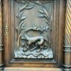 Антикварний буфет виготовлений з масиву горіхового дерева. Прекрасна, тонка робота майстра в кожній деталі. Вертикальні поверхні оздоблені горельєфами з ренесансною тематикою. Корона буфету увінчана галереєю з балясинами та фронтальним зображенням чоловічого персонажа. Двері верхнього ярусу прикрашені візерунками та сюжетною сценою, їх підтримують дві колони з гротескними персонажами-шутами. На нижньому ярусі на панелях дверей зображені дракони, розділені витими колонами. Даний буфет неодмінно стане чудовим доповненням естетичної кухні чи столової кімнати.