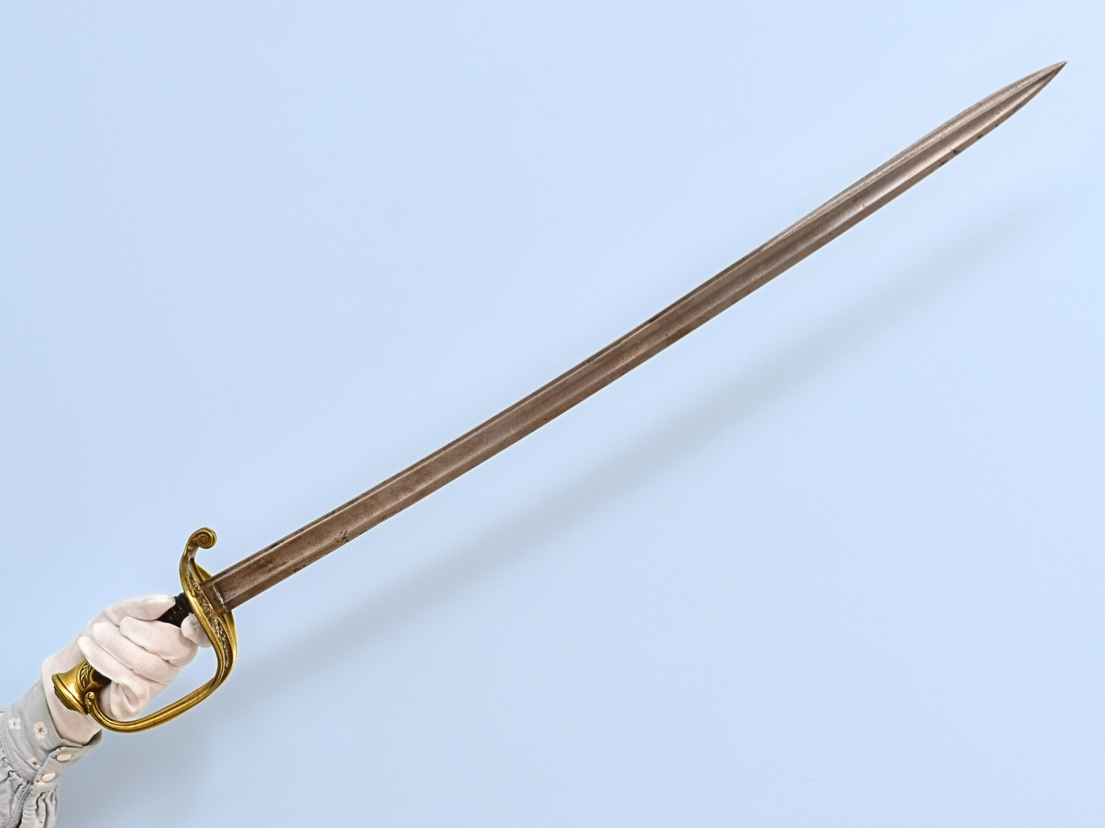 Officer's sabre of the infantry model of 1845 (France). The blade is slightly curved, with one narrow edge. The hilt is made of black horn, without wire along the grooves. The hilt fittings are bronze. On the shield there is a slotted image of a floral ornament. The saber was in service with the French infantry from 1846 until the end of World War I.