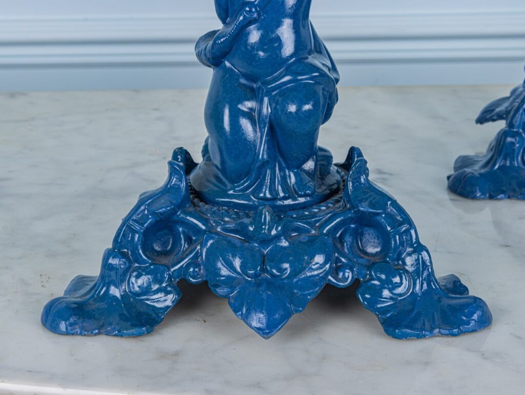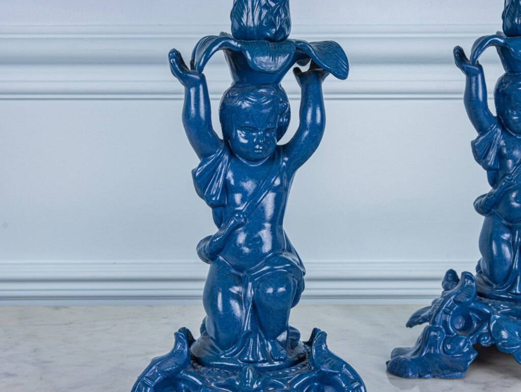 Пара рідкісних антикварних гасових ламп у хорошому стані. Вони мають рідні плафони з тонкого скла у формі макової коробочки з верхівʼям-спідничкою. Поверхня плафонів вкрита тонкими глянцевими візерунками на матовому тлі. Ємність для палива прозора та прикрашена матовим меандром. Ніжки ламп виконані у вигляді путті, які тримають над головою квітку. Всю цю неймовірну скульптурну композицію покриває емаль глибокого блакитного кольору. Механізм форсунки добре прокручується, на кільці присутнє маркування німецького виробника механізму MATADOR (IMPORT). Гніт в наявності, колби та плафони цілі.