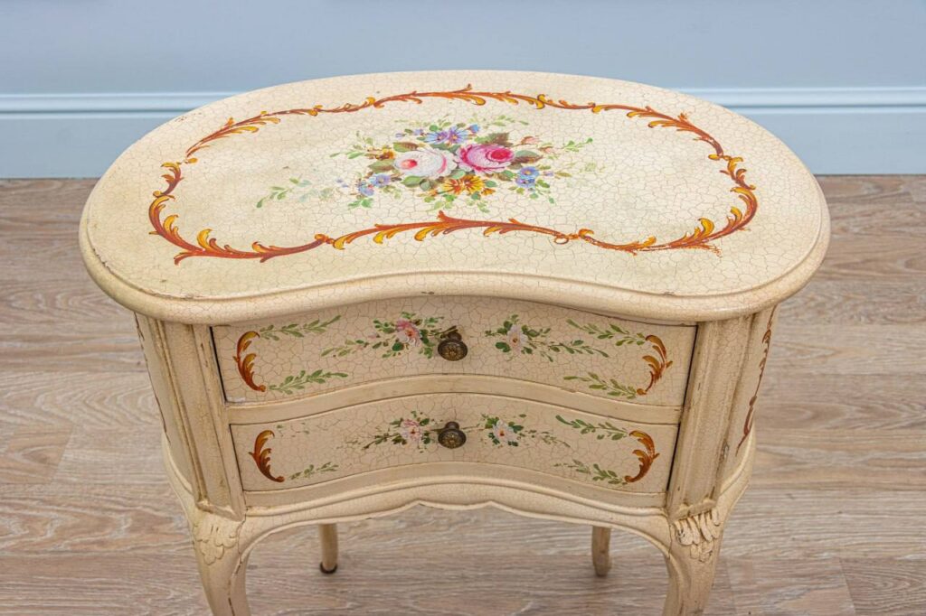 Wonderful vintage bedside tables in Venetian style. The extraordinary barrel-shaped form of the bedside table with four curved legs and delicate, unobtrusive decoration is a perfect example of Italian art from the mid-twentieth century. The two-drawer nightstands are decorated with a crackle patina and hand-painted. All surfaces are covered with reserves and medallions with floral and floral compositions. The furniture is in good condition.