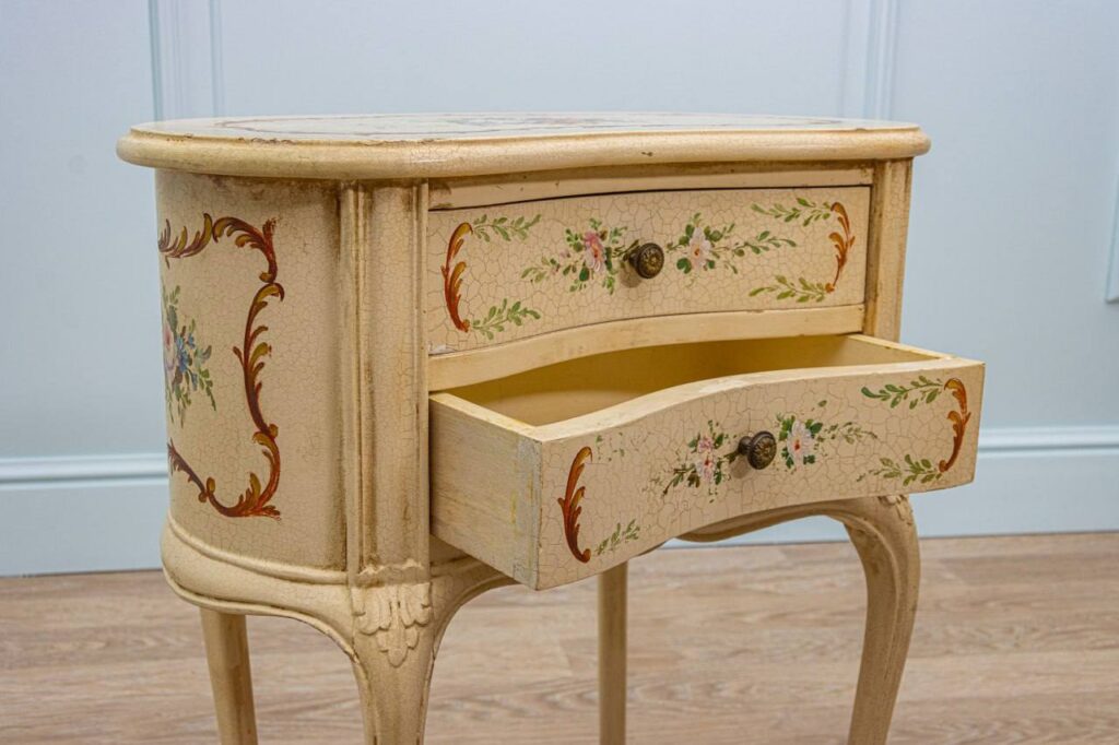 Чудові вінтажні тумбочки у венеційському стилі. Неординарна бочкоподібна форма, на чотирьох гнутих ніжках, з ніжним, ненавʼязливим декором — це прекрасний екземпляр італійського мистецтва середини XX століття. Тумбочки на дві шухляди, декоровані кракелюрною патиною й оздоблені ручним розписом. Всі поверхні вкриті резервами та медальйонами з рослинними й квітковими композиціями. Меблі мають гарний стан.