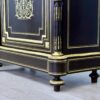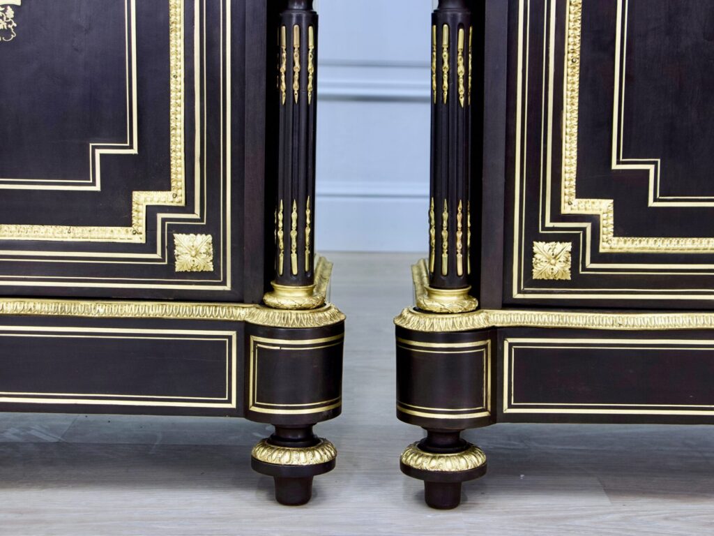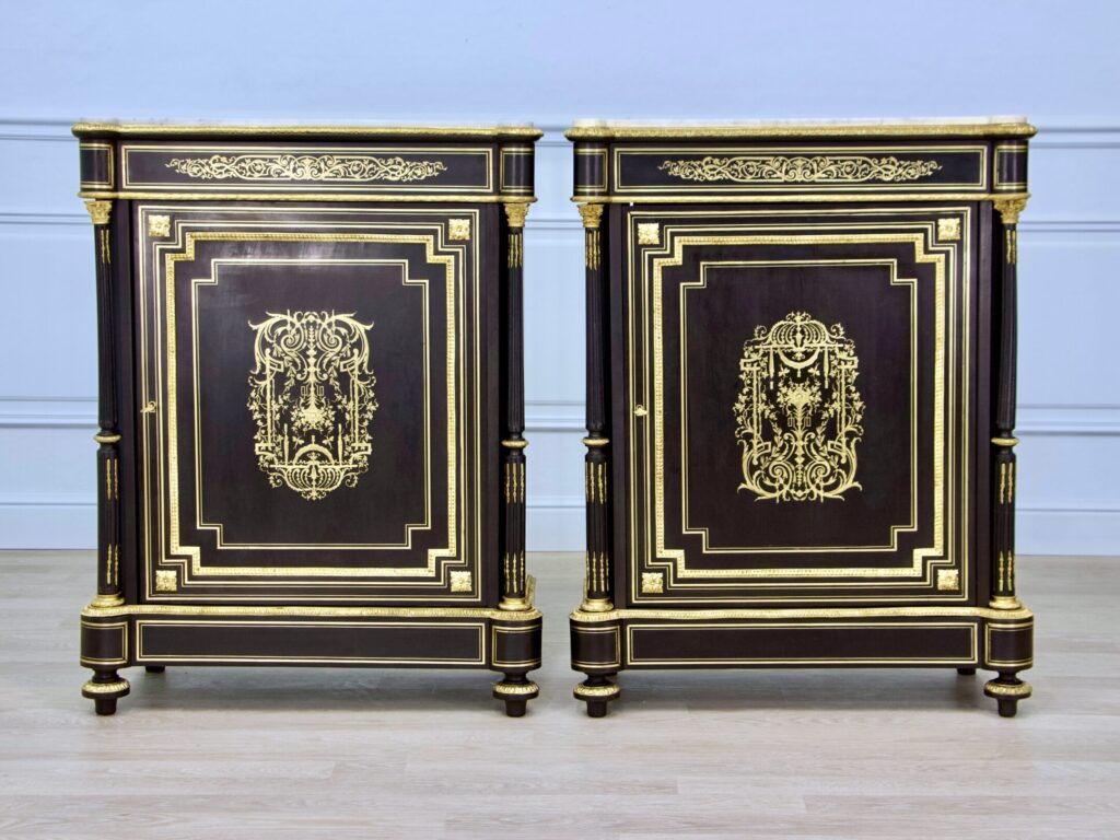 Пара антикварних комодів останньої третини ХІХ століття, виготовлених з масиву груші, покритих чорним лаком та прикрашених інтарсією з латуні. Декор з врізної латуні на корпусі поєднаний з об’ємними елементами з золоченої бронзи. Широкі фасадні двері обрамлені тонкими канелюрованими колонами. У центрі – медальйон у вигляді тонкої віньєтки в стилі французького неокласицизму. Стільниця виготовлена з білого мармуру. Пара абсолютно ідентичних комодів епохи французького історизму є рідкісною пропозицією для ринку України. Предмети після реставрації.