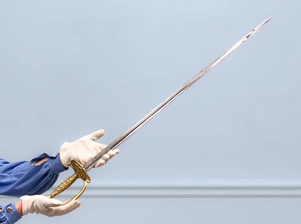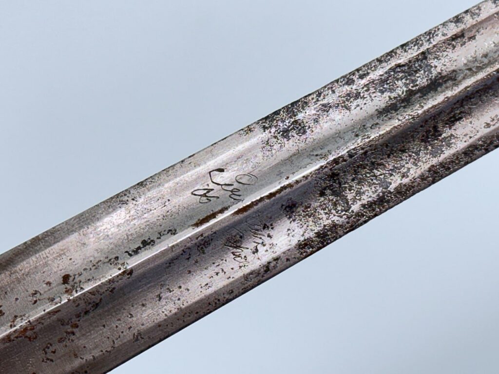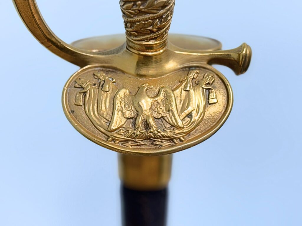 Шпага французька унтер-офіцерська жандармерії гвардії Парижа і жандармерії імператорської гвардії зразка 1853 року. Клинок сталевий, прямий, дволезний, з двома широкими долами з обох боків та ребром по центру. На клинку із зовнішнього боку на п’яті клеймо “В під зіркою в овалі” – штамп інспектора збройової мануфактури Клінгенталь Шарля Бюхле, який працював у 1890-1895 рр. На клинку напис голкою “Coulaux & Cie” – Куло брати, Клінгенталь (Франція). Ефес складається з рукояті та гарди. Рукоять латунна, веретеноподібна, прикрашена рослинними орнаментами по спіралі. Навершя у формі кулі з круглою голівкою зверху. Гарда з однією захисною D-подібною дужкою, яка плавно переходить у хрестовину, дальній кінець якої прямий, короткий з півкулею на кінці. На перехресті розташовуються два овальні щитки. На лицьовому щитку нанесене рельєфне зображення орла на тлі чотирьох прапорів на акросталі (гравіювання крапками) – емблема унтер-офіцерів і бригадирів жандармерії гвардії Парижа і жандармерії імператорської гвардії. Піхви шкіряні чорні, без дерев’яної основи, з латунним приладом, що складається з гирла з фігурним шпеньком і наконечника з кулькою на кінці.