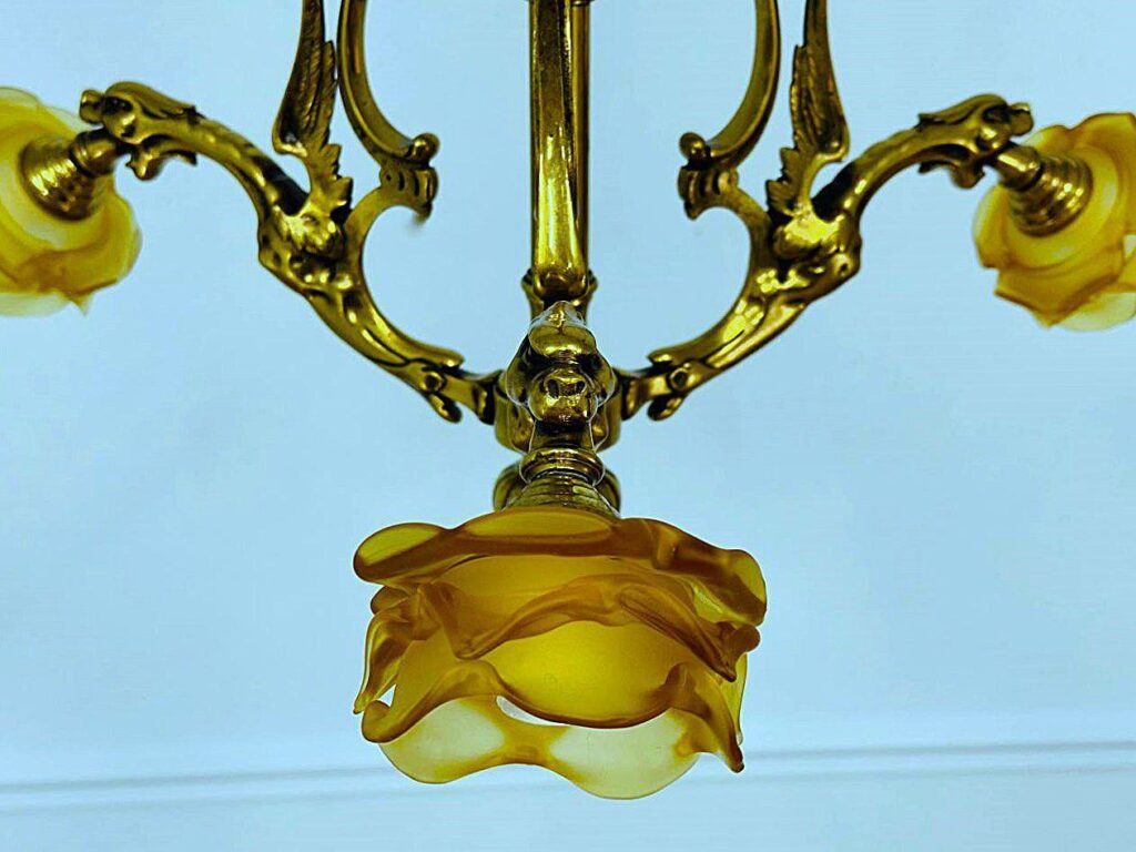 Вінтажна люстра з бронзи, основа виробу виготовлена у техніці литва бронзи та розрахована на три лампи з цоколем Е27. Кожен патрон оснащений витонченим плафоном у формі квітки ручної роботи з кольорового матового скла. Ріжки мають вигляд химерних грифонів. Унікальний предмет декору, який ідеально доповнить концепцію класичного стилю інтер’єру.