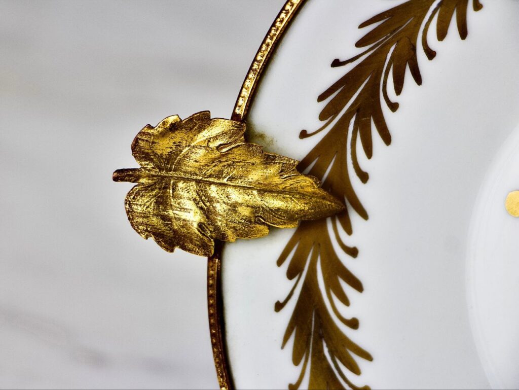 Antique white porcelain saucer in the Empire style. The saucer is produced by the famous Limoges manufacturer Giraup Limoges of laconic form with gilded decoration depicting the main heraldic symbol of Napoleon Bonaparte - a bee. Two thin leaves of gilded brass are mounted on both sides of the saucer. There is a maker's mark on the bottom.