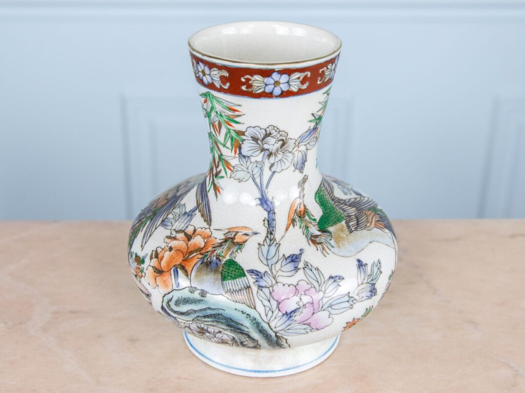 Antique Chinese vase of the late XIX century, made in the technique of polychrome overglaze painting on porcelain. The vase is painted in the traditional style of the eighteenth century, which was popular during the reign of Emperor Qianlong. The surface is decorated with images of pheasants and flowers, and the glaze has a craquelure.