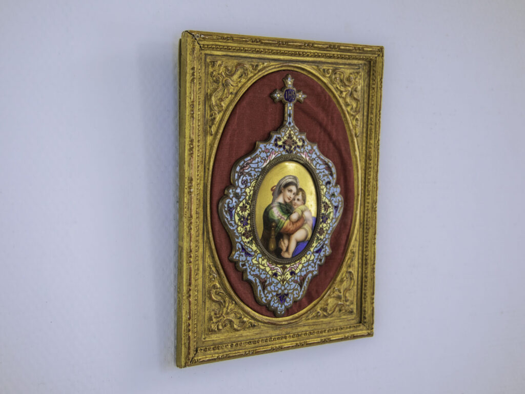 Вінтажне панно з зображенням Діви Марії. Образ Діви Марії з немовлям у кріслі популярний серед релігійних сюжетів, створений у техніці емалей на порцеляні. Живопис обрамлений у фігурну оправу в техніці емалі Cloisonné та встановлений на щит, покритий оксамитом, і обрамлений у золочену раму. Рідкісна колекційна річ варта уваги, створена в складних та неймовірно красивих техніках.