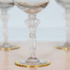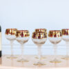 Набір вінтажних келихів з вишуканими ніжками у вигляді фігур Венери. Келихи для вина виготовлені з прозорого кришталю та прикрашені позолотою. Верхній кант оздоблений широкою рубіновою стрічкою з візерунком виноградного листя. Комплект з шести келихів виробництва Bayel.