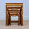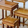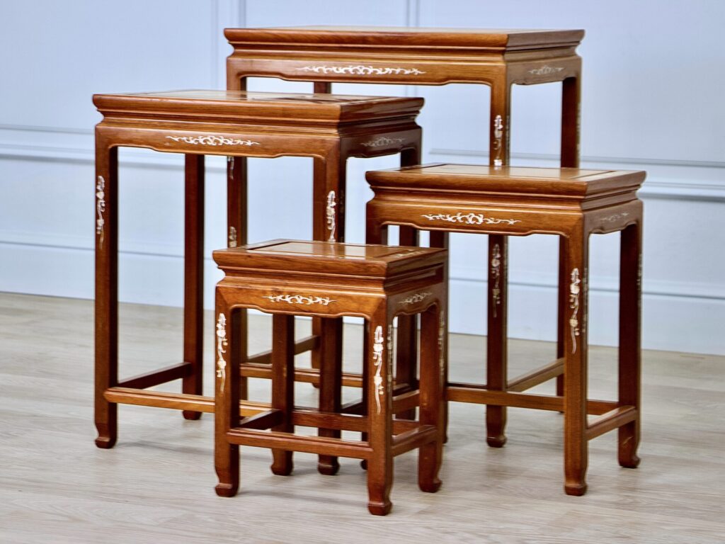 Елегантний набір з чотирьох дерев’яних столиків, які вкладаються один в один і оздоблені традиційними китайськими мотивами. Перламутрова інкрустація має вигляд декоративних візерунків з рослинними елементами. Практичний і водночас декоративний предмет меблів, який ідеально підходить для інтер’єру.