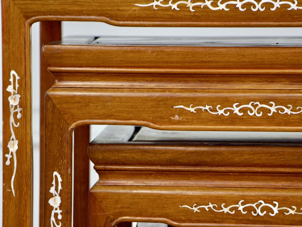 An elegant set of four nesting wooden tables, adorned with traditional Chinese motifs. The mother-of-pearl inlay on the legs and aprons forms delicate decorative patterns of floral elements. Both practical and ornamental, this set is perfectly suited for interiors in Chinoiserie, eclectic, or classical Eastern styles.
