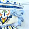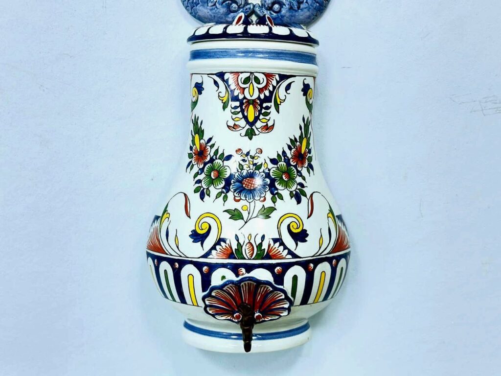Вінтажний фаянсовий декоративний фонтан-умивальник прикрашений підглазурним розписом з квітковими та мушлевими візерунками. Предмет є реплікою на руанські фаянсові вироби XVIII століття. Ручний розпис – візитівка відомого французького виробника фаянсу «Gien», який бере свій початок в далекому 1821 році та здобув свою славу завдяки використанню гербів дворянства та королівських дворів на своїх виробах. Мануфактура продовжує діяльність понині та успішно створює нові колекції. Лідер у сфері виробів з фаянсу – він став одним з символів мистецтва Франції. На дні присутнє фабричне клеймо другої половини XX століття. Фонтан і чаша у прекрасному стані, без сколів та пошкоджень. Може бути використаний як декоративний предмет.