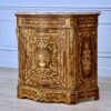 Антикварний комод виготовлений з масиву дерева та інкрустований шпоном. Корпус фігурної форми з мармуровою стільницею та неймовірною інкрустацією різними породами дерева. Маркетрі зі складним орнаментальним декором доповнене тонким литвом з бронзи. У центрі дверей медальйон з квітковим букетом у вазі. Комод має одну шухляду зверху та поличку всередині. Функціональний предмет, який стане домінантою інтер’єру.