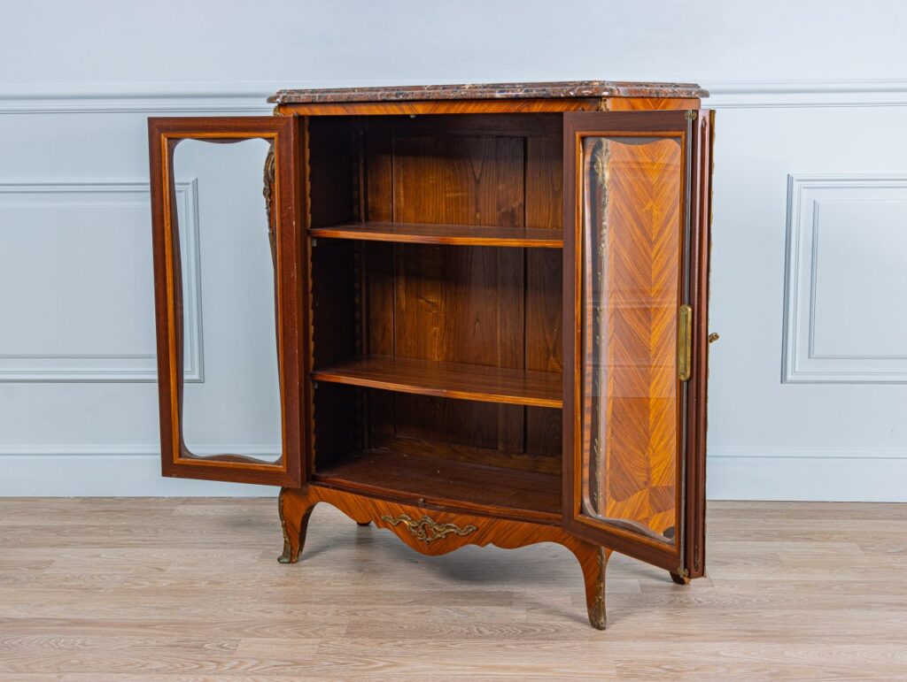 Вінтажний комод-вітрина виготовлений з масиву дерева та інкрустований цінним шпоном горіха, що створює унікальний та неповторний малюнок. Вигнуті ніжки виробу декоровані бронзовими накладками та фурнітурою у вигляді природних рослинних орнаментів. Комод має дві полиці всередині та двоє засклених дверей з замком і оригінальним ключем. Вітрина ідеально підходить для зберігання книг, посуду та інших речей. Зверху мармурова стільниця. Функціональний та універсальний предмет, який гарно доповнить інтер’єр.