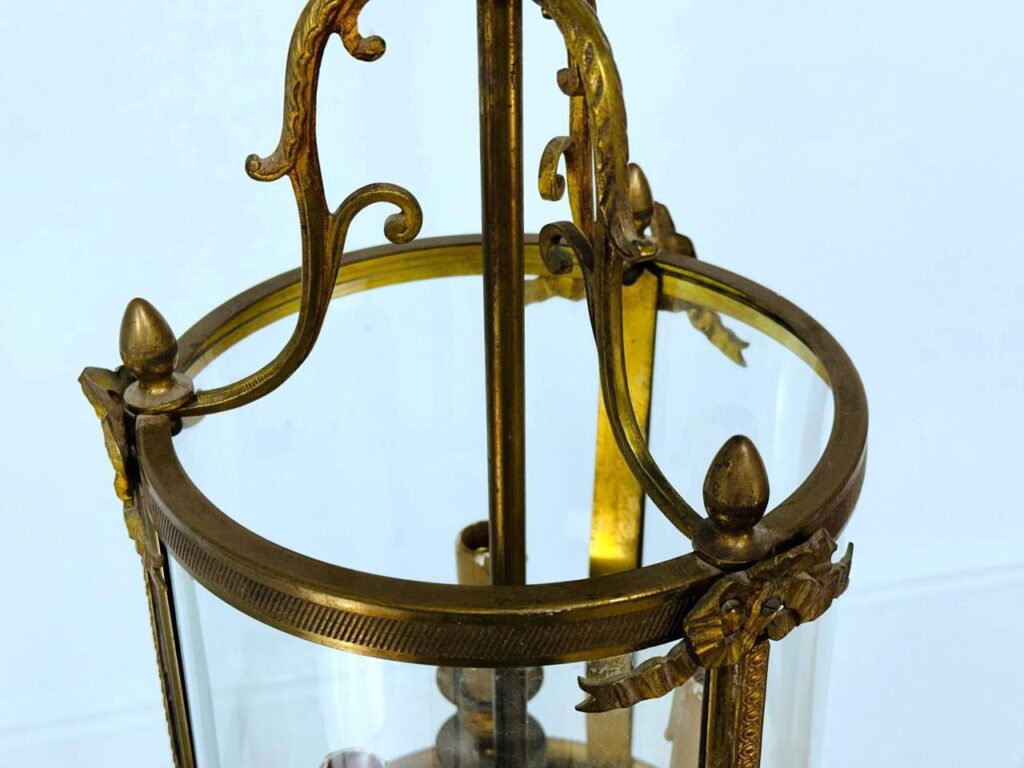 Вінтажний світильник ліхтарного типу на три вогні, має циліндричну форму та високе кріплення у вигляді тонких гілочок, які утримують три патрони, оточені скляною колбою. Світильник у хорошому стані, метал має приємну благородну патину.