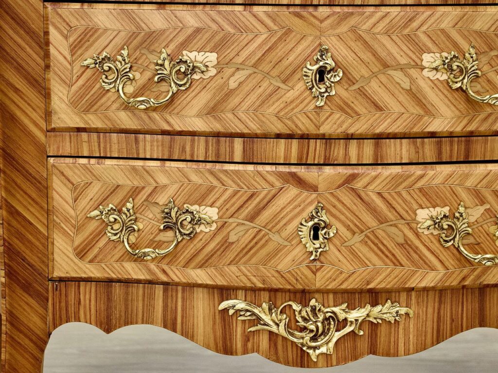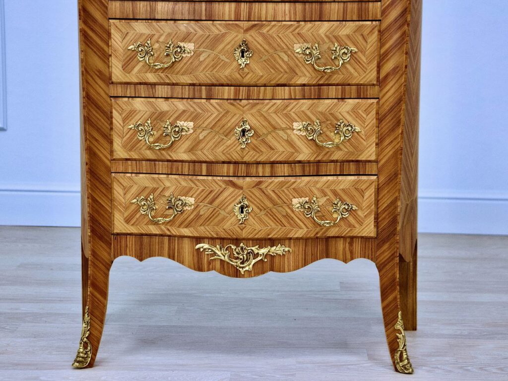 Антикварний класичний секретер, оздоблений у техніці маркетрі з використанням цінних порід дерева, а також художнього литва бронзи, з якої виготовлена фурнітура та накладки у вигляді орнаментальних віньєток. Внутрішня робоча поверхня оздоблена шкірою червоного кольору із золотим тисненням. Стільниця секретера виготовлена з мармуру теплого відтінку. Лаконічні форми, стриманий декор та водночас витончений силует прекрасно доповнять інтерʼєр.