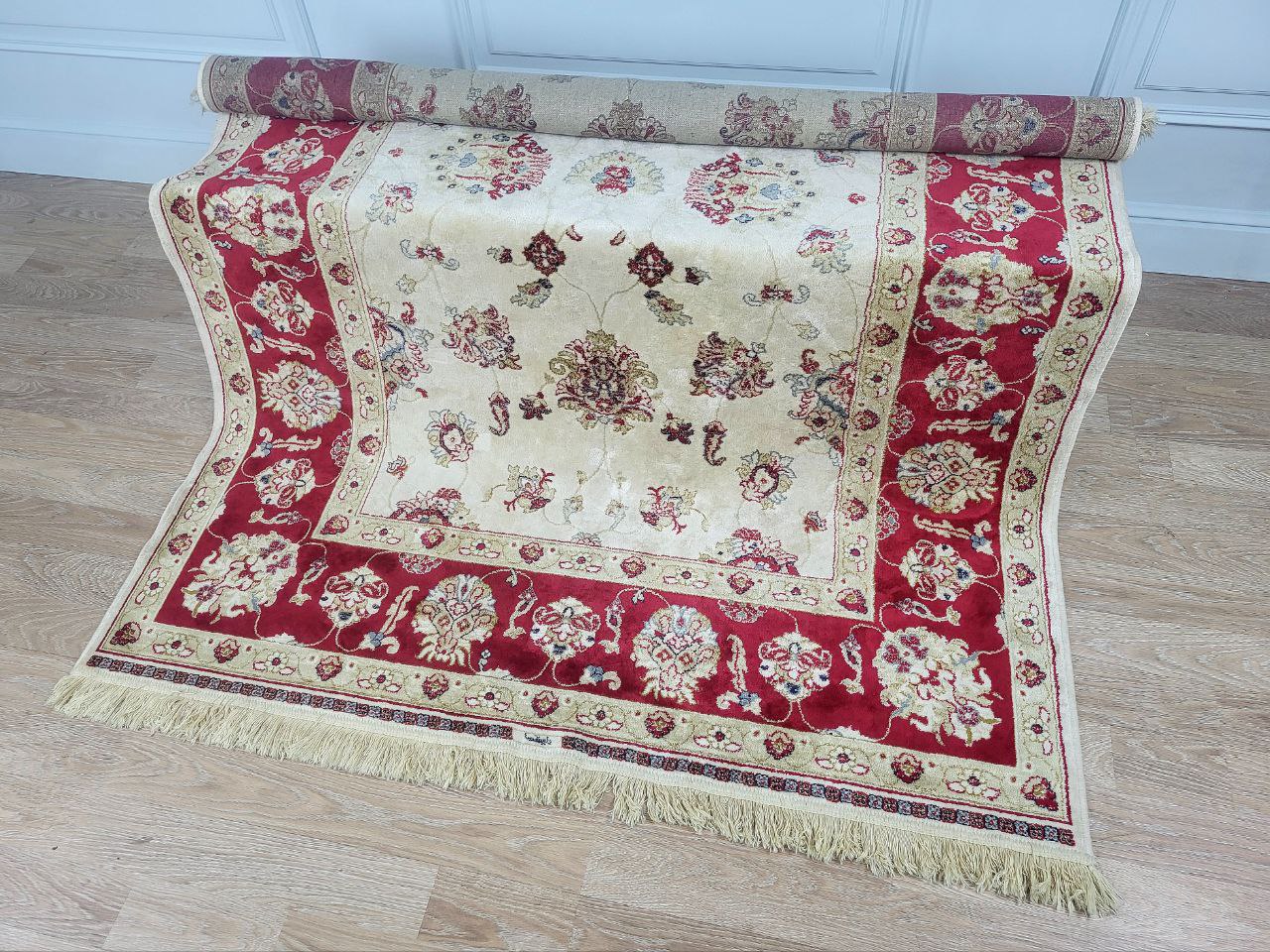 Бельгійський килим з ніжної віскози, тонкий і витончений, вирізняється високою щільністю та хорошими експлуатаційними якостями. Низький віскозний ворс є дуже зручним у використанні, переливається шовковим блиском та має насичену кольорову гаму. Дизайн класичного стилю у вигляді рослинного орнаменту. Чудово виглядатиме в інтер’єрі.