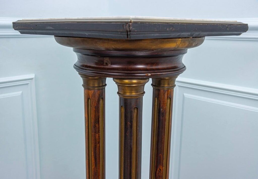 An antique stand from the end of the 19th century in an original design. The shape seems to imitate a Doric column, but the column itself is formed by four thin fluted balusters resting on a round base with a quadrangular stylobate below. The upper part repeats the outline of the base. Metal decor is an additional decorative accent.