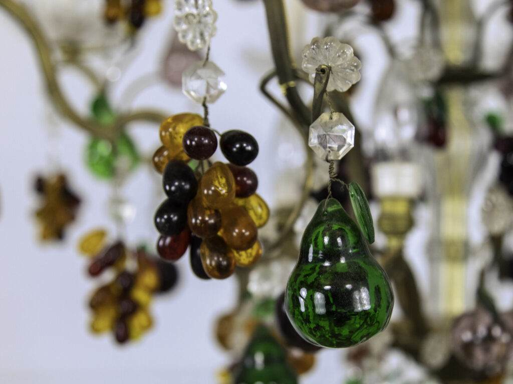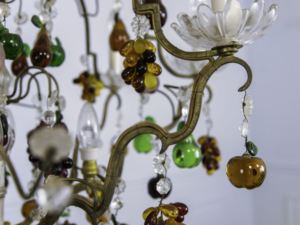 Бронзова люстра з декором з муранського скла на 11 вогнів. Має чудову композицію з апетитних фруктів. Яблука, груші та виноград розвішані наче на райському дереві, разом з прозорими кришталиками та квітами створюють соковиту композицію, яка стане окрасою оселі. Гілки люстри завершують елегантні ложа для елементів освітлення. Мистецтво створення муранського скла зародилося в Італії багато століть тому. За цей час ремесло переживало різні часи: забувалося і відроджувалося знову. У 1859 році Антоніо Сальвіаті відкрив фабрику для виготовлення кольорової смальти, згодом його компанія «Salviati & Co» здобула популярність по всій Європі. Вони зібрали традиції венеційських склодувів та використовували їх у створенні своїх шедеврів. Насичений та чистий колір кришталевих виробів досягався лише з використанням натуральних мінеральних пігментів.