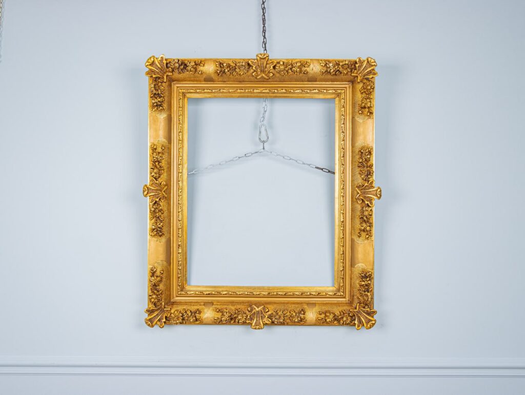Антикварная рама в прекрасном исполнении. Багет в виде широкого торуса с резервами цветов и коронами из листьев. По внутреннему периметру две лаконичные скоции разграничены тонким орнаментальным поясом. Деликатная патина и сочетание матовой и глянцевой поверхности делают этот багет чрезвычайно выразительным.