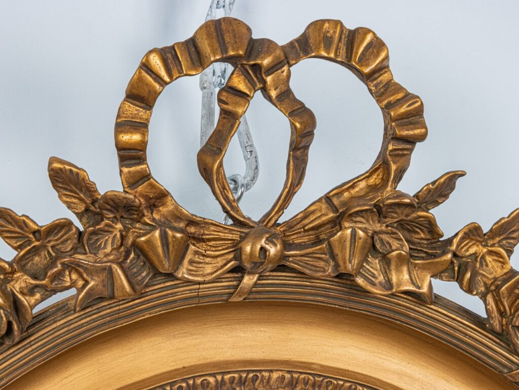 Великолепная антикварная рама овальной формы, сочетающая в себе несколько видов орнаментов, ампирный фриз, обернутый лавровой лентой с бантом, от которого отходят ветви гирлянд. Рельеф прекрасно подчеркивает бронзово-золотой цвет рамы.