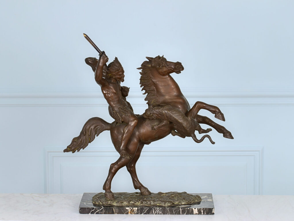 Антикварная бронзовая скульптура с подписью на стилобате CAMPAJOLA — итальянский художник, работавший в Неаполе в XIX-XX веках. Эта скульптура изображает бой индейца, верхом на лошади, с львицей. В правой руке он держит львенка, а левой замахивается мечом. Композиция полна динамики и экспрессивности, фигура невероятно сложна в исполнении и держится только на двух точках опоры. Подобное художественное решение передает мимолетный момент, это буквально застывшее мгновение во время ожесточенного противостояния человека и природы. Работы этого скульптора имеют постоянный успех на европейских и мировых аукционах.