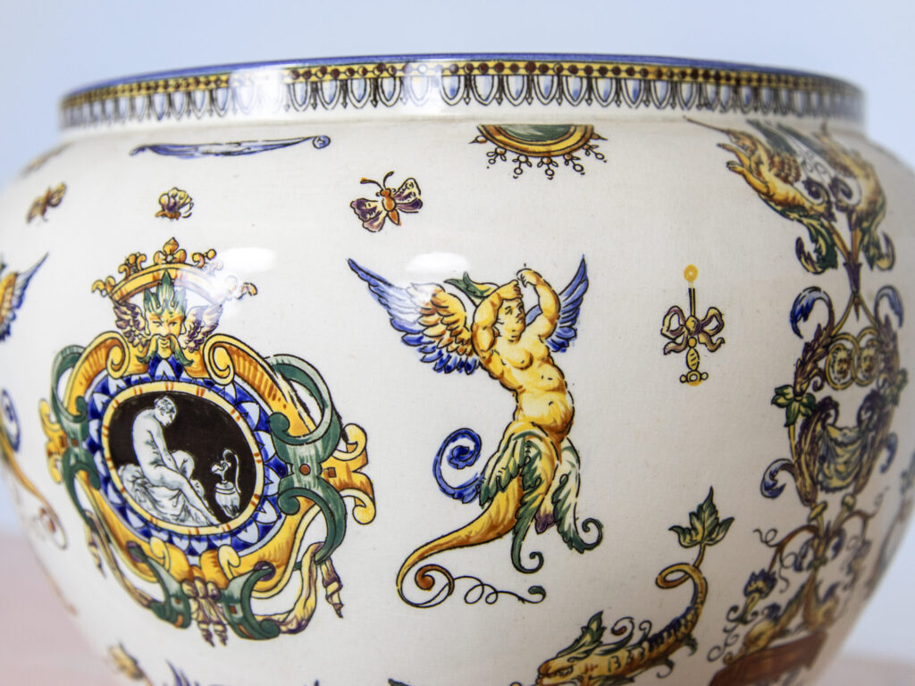 Фаянсовое кашпо изготовлено после 1875 года во Франции. Фаянсовая фабрика Gien находится в долине Луары, в самом сердце Франции, их славная история восходит к 1821 году. Со второй половины XIX века фаянсовая мастерская стала более творческой. Со временем мастера глиняной посуды стали более опытными, приобретая навыки и мастерство. Фаянс-мастерская Жьен была разнообразной с технической и художественной точки зрения. Вся работа и усилия получили признание во Франции и за рубежом и отмечены многими призами, а также золотыми и серебряными медалями на всемирных выставках. Эта модель кашпо принадлежит к серии «Renaissance» и изображает причудливые создания, отсылающие зрителя к античным образцам, и характерные узоры, называемые арабесками.