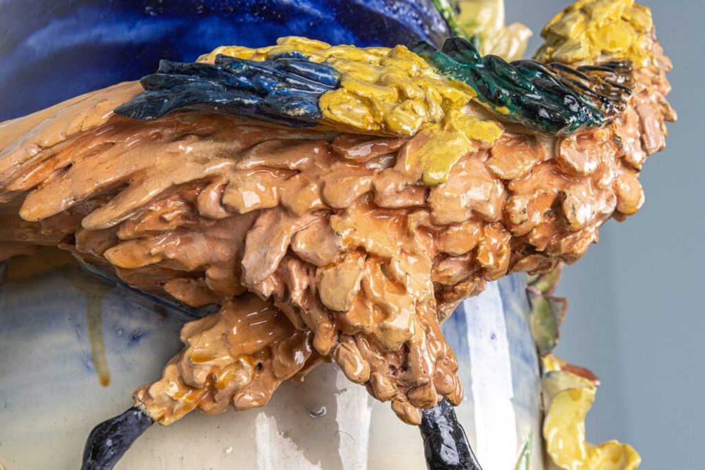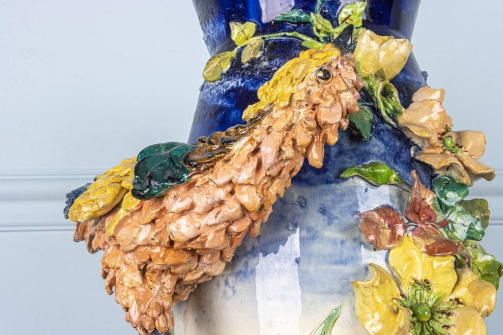 Антикварная ваза из барботина является прекрасным образцом ручной работы своего времени. Барботин — это техника, в которой на поверхность керамического изделия наносится слой глины, создавая объемный декоративный элемент. Эта техника позволяет достичь уникального эффекта, который мы видим на этой вазе. Ручная роспись и лепка подчеркивают индивидуальность и уникальность каждого элемента. Ваза выполнена в основном в глубоком кобальтовом цвете с желто-розовым барельефным цветочным узором, что придает ей особую декоративность. Керамическая скульптура птицы, которая как бы обходит корпус вазы по кругу, делает ее чрезвычайно интересным образцом декоративно-прикладного искусства.