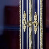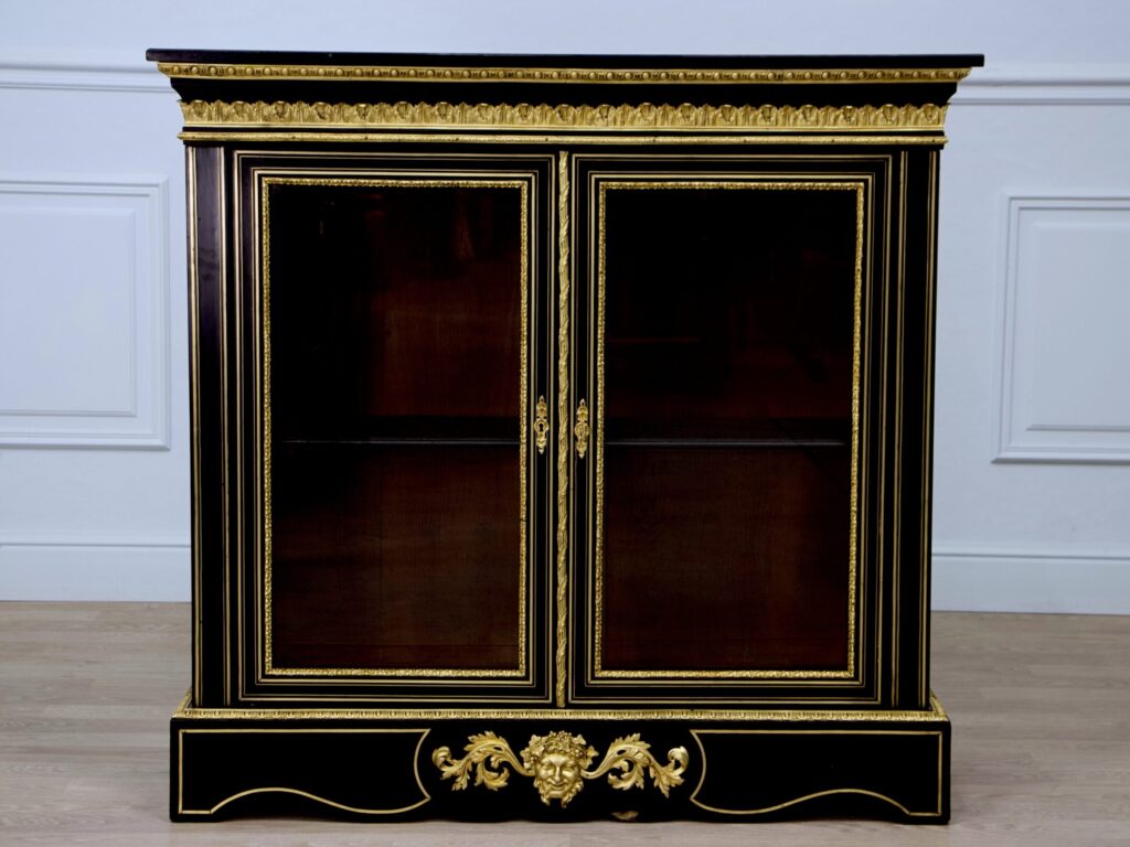 Антикварная витрина изготовлена из массива груши, покрыта черным лаком и украшена позолоченными бронзовыми и латунными накладками по всему периметру изделия. Витрина оснащена одной полкой внутри, а двери закрываются на ключ. Внизу на фасаде размещен бронзовый барельеф с маскароном в центре. Это изделие станет прекрасным дополнением интерьера.