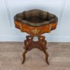 Антикварная жардиньерка изготовлена из дерева. Предмет имеет изысканную отделку, где сочетаются маркетри и бронзовые декоративные накладки с ренессансными образами и узорами. Резервуар кашпо очерчивает тонкий бронзовый пояс с перфорацией.