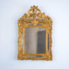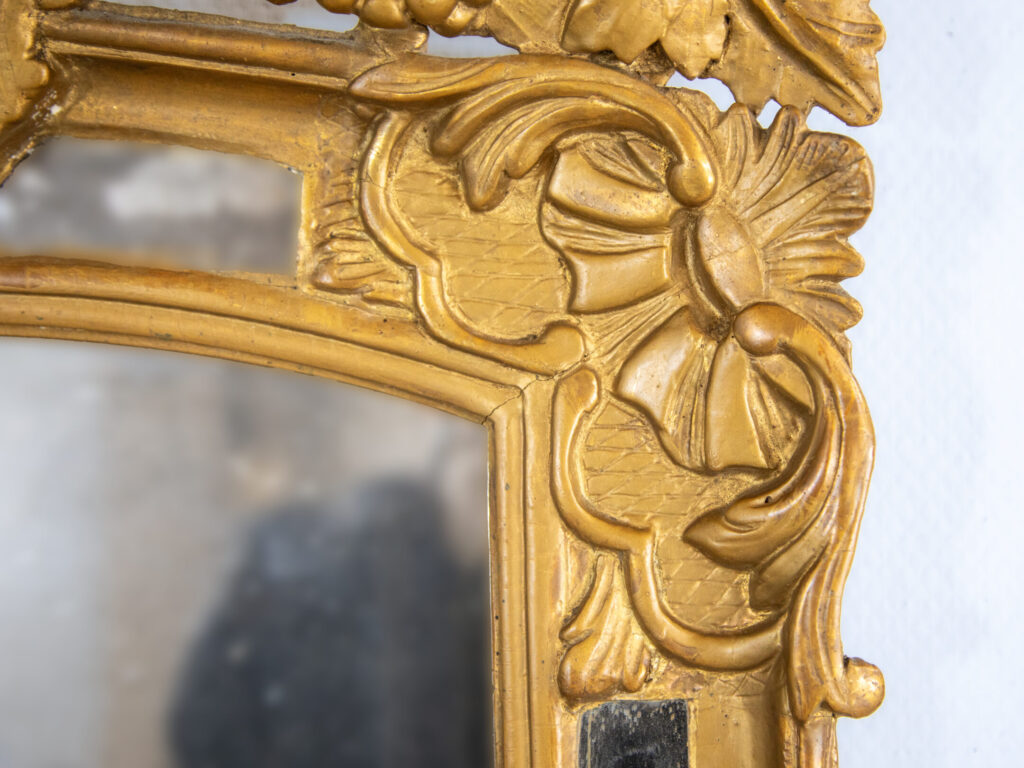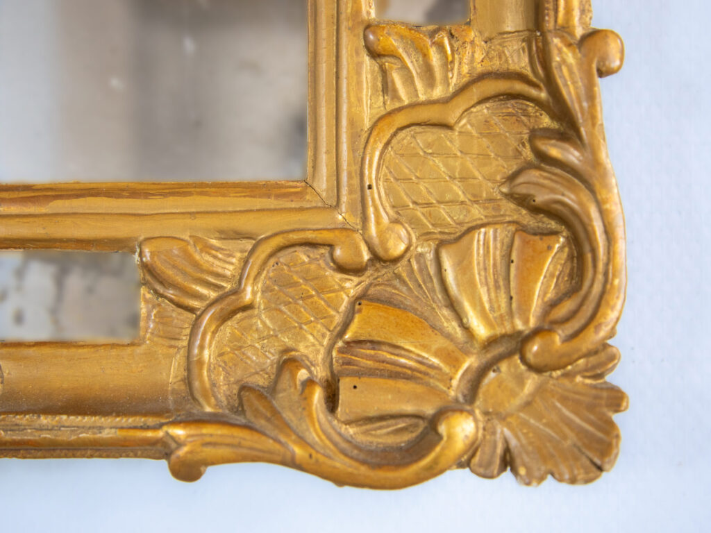 Позолоченная деревянная рама с фронтоном и имитацией второй внутренней рамы, украшенная богатыми барочными орнаментальными элементами: листьями аканта, цветочным букетом, окруженным волютами и виноградной лозой, с использованием мотивов ракушки на углах, внутренние плоскости которых дополнены ромбовидной резьбой. Зеркало относится к конечному периоду правления Людовика XV, где смешивался декор уходящей эпохи барокко и близкого рококо, характерного для начала стиля французского регентства. Интерьер этого периода динамичный, изящный с присутствующей легкой парадностью.