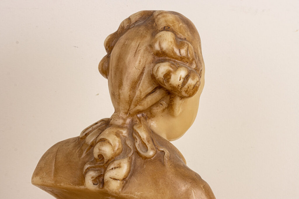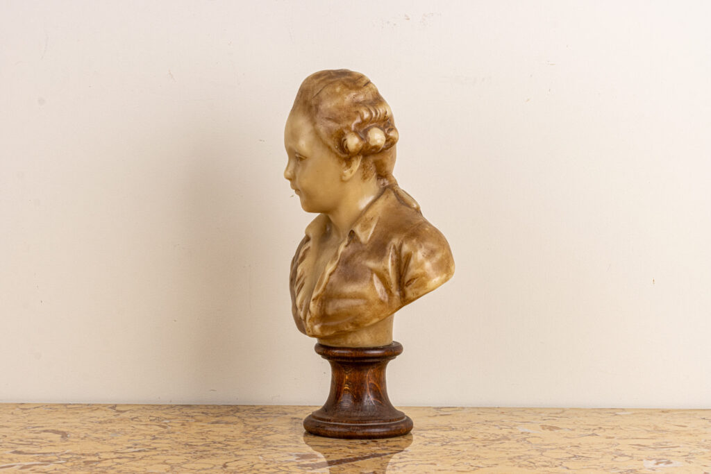 Небольшой восковой бюст мальчика, вероятно начала 20 века, выполненный в стиле работ Филиппа Ролана Роланда. Погрудное изображение ребенка, одетого в камзол и парик с локонами, дополнительно покрыто патиной, что придает бюсту особую выразительность. Бюст помещен на небольшой деревянный постамент.