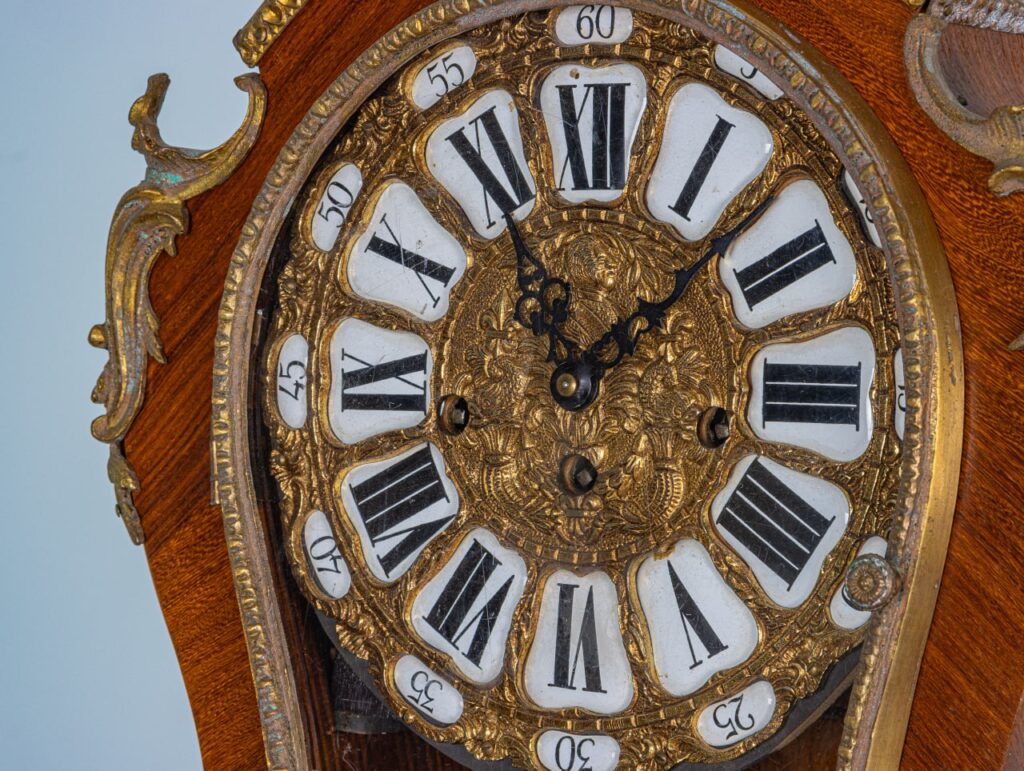 Невероятные часы в стилистике второго рококо. Изысканный силуэт корпуса часов гармонирует с богатым бронзовым декором и отсылает нас к лучшим образцам эпохи XVIII века. Часы и постамент украшены в технике маркетри и имеют лаконичную геометрию, дополненную бронзовыми элементами. Часы увенчаны фигурой ангела с фанфарой — символом «добрых предвестников», а роскошный бронзовый циферблат дополнен композицией из путто на абстрактном фоне. Бьет каждый четверть часа. Цена включает ревизию механизма, в комплекте есть ключ.