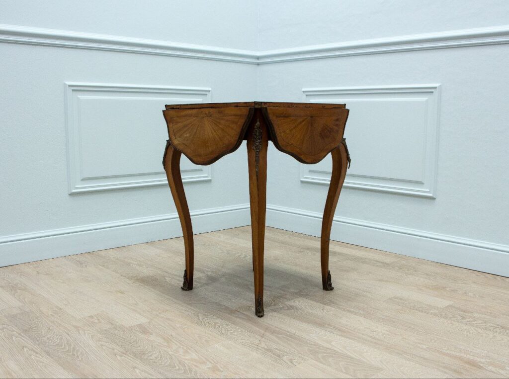 Антикварный игровой столик с четырьмя раскладными панелями. Гармоничный дизайн и функциональность присущи этому изделию. Ножки-кабриоли, удерживающие столешницу, украшены бронзовыми накладками и сабо. Столешница и раскладные панели украшены маркетри.