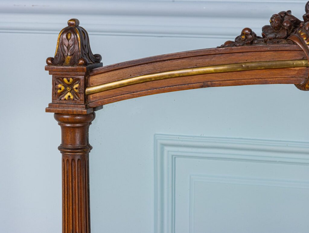 Антикварный экран из стекла в деревянной резной раме. Деликатная резьба, выполненная опытным мастером, имеет акцент в виде золотых узоров. Поверхность стеклянного экрана украшена масляной росписью. Нарисованный букет цветов выплывает из нижнего правого угла и создает динамичную композицию. Внизу композиции есть подпись художника. Экран в хорошем состоянии.