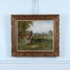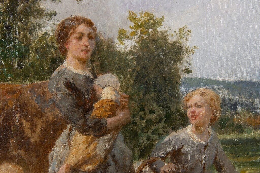 Жанровая живопись в прекрасном исполнении. Яркая цветовая палитра и экспрессионистическая манера в сочетании с прекрасной композицией. В центре композиции молодая женщина с детьми, которые пасут скот, на фоне идиллического сельского пейзажа. Картина обрамлена в деревянную раму с поверхностным позолочением и внутренней полосой из полотняной ткани.