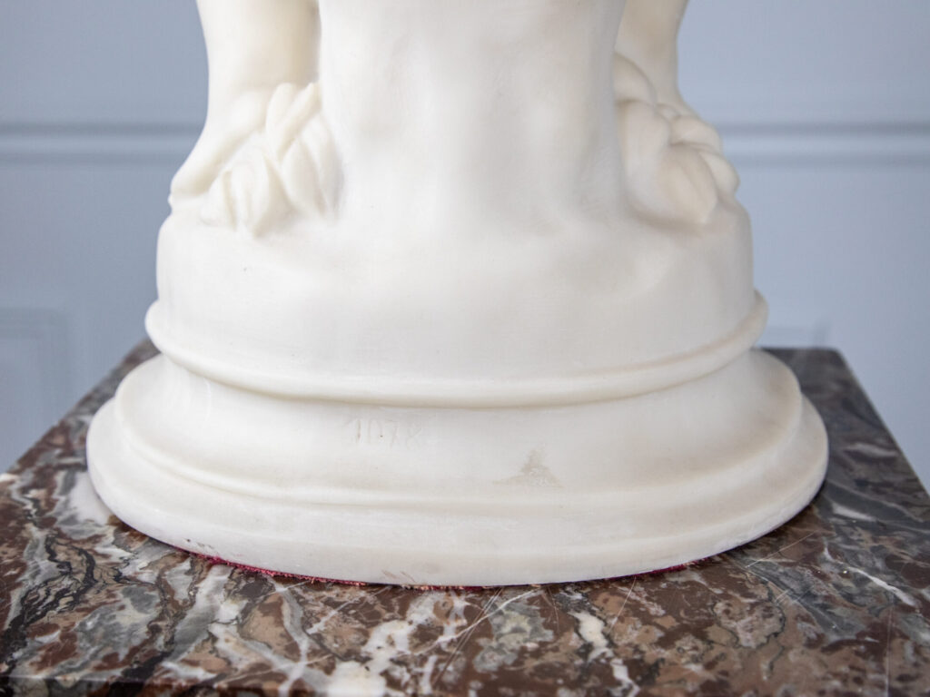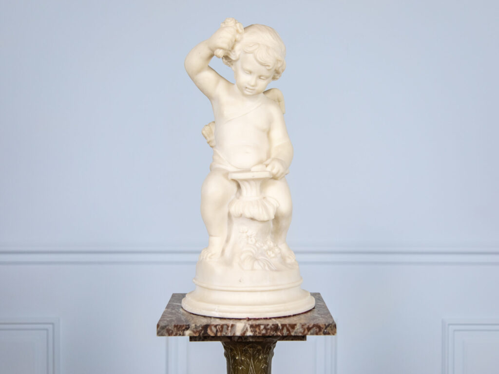 Декоративная фигура Купидона, изображенного в момент ковки стрелы любви. Маленький амур сидит на стилизованном пеньке с цветами у ног, что подчеркивает нежность и весеннее настроение композиции. На его бедре — колчан со стрелами, а в правой руке — цветочный молоточек, поднятый над головой в движении, словно он скоро ударит по стреле, которую держит левой рукой на наковальне, вмонтированной в основание пенька. Фигура установлена на классическую круглую основу со ступенчатой нарезкой, что подчеркивает ее декоративный характер. Вероятно, это французская реплика начала XX века по мотивам скульптур эпохи неоклассицизма. Подобные композиции появлялись в работах скульпторов XVIII века, в частности в творчестве Этьена-Мориса Фальконе.