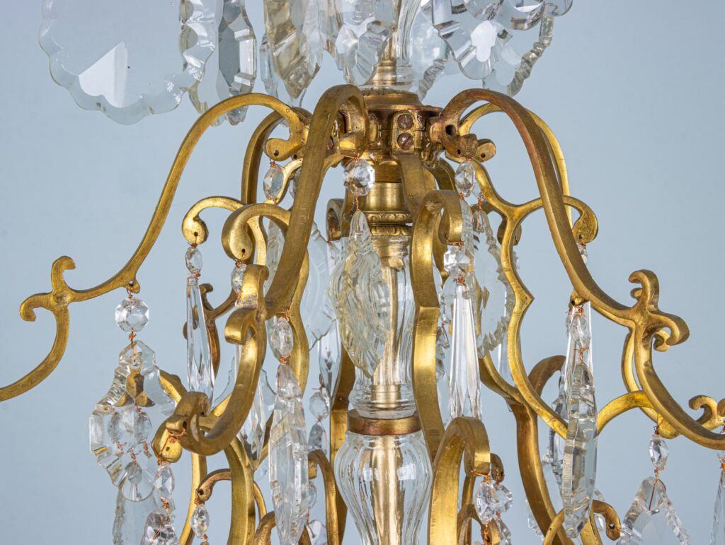A large crystal chandelier of the second half of the 20th century. A sprawling bronze frame with several tiers of branches is decorated with a variety of crystal pendants of various shapes and a central column wrapped in figured crystal. Fourteen lights will fill a large hall with light, and crystal elements will create a fabulous play of light that will decorate any interior. The chandelier has a working electrification and is ready for use.