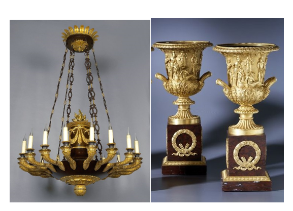 Бронзові деталі меблів, світильники, торшери, канделябри, вази, корпуси настінних і настільних годинників виготовляла паризька майстерня П’єра-Філіппа Томіра. З 1805 року Томір був «придворним карбувальником» Бонапарта. В меблях створених в його майстерні червоне дерево поєднувалося з позолоченою і матово-чорною патинованою бронзою, що нагадує базальти Стародавнього Єгипту. Переважна більшість орнаментів античного походження: набори геометричних і рослинних орнаментів включають меандри, пальметки, плетінки, лаврові гілки, стрічки, пальмове, лотосове та акантове листя, квіткові гірлянди.